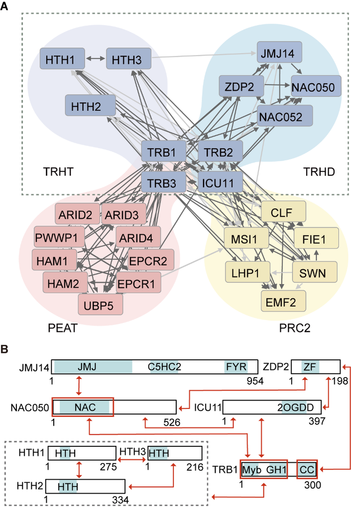 该研究通过蛋白亲和纯化结合质谱分析(AP-MS)系统鉴定出TRB1、TRB2、TRB3(TRB1/2/3)的结合蛋白,证实TRB1/2/3不仅参与PEAT复合体和PRC2复合体的形成,还能组装成两种功能冗余的新型复合体:TRHT(包含TRB1/2/3、ICU11 和 HTH1/2/3)与 TRHD(包含 TRB1/2/3、ICU11、JMJ14、NAC050/052 和 ZDP2),其中TRB1/2/3 和 ICU11 是这两个复合体的共有亚基(图1A)。随后,利用酵母双杂交、体外pull-down等实验,进一步明确了两个复合体各组分之间的相互作用模式(图1B)。
