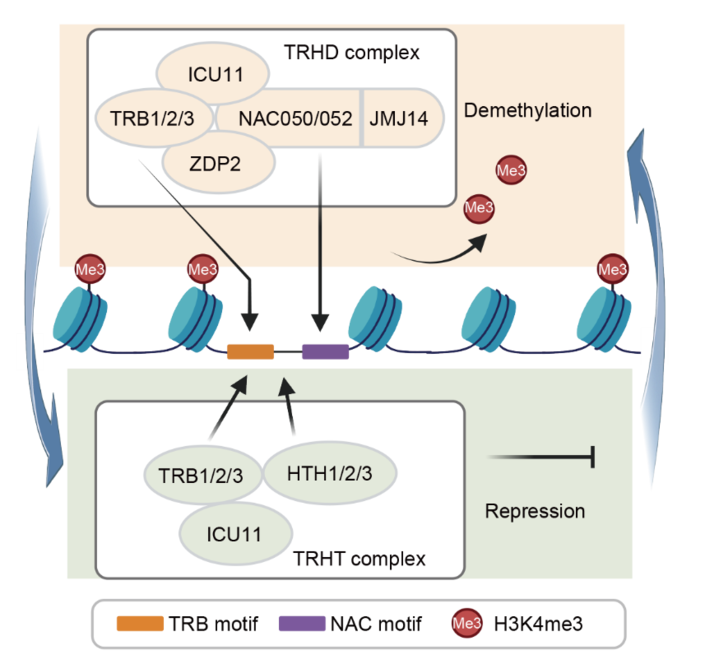 何新建实验室在《Advanced Science》在线发表了题为“Arabidopsis TRB proteins form two closely related complexes to mediate H3K4me3 demethylation and transcriptional repression”的研究论文。该研究发现了拟南芥中两种紧密关联的新型复合体TRHT和TRHD,揭示了它们协同其他组蛋白修饰介导组蛋白H3K4me3去甲基化的分子机制。