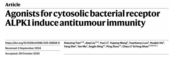邵峰实验室在《Nature》上发表了题为“Agonists for cytosolic bacterial receptor ALPK1 induce antitumour immunity”的研究成果。继TLR和STING激动剂后,该研究首次提出激活胞质模式识别受体ALPK1能够诱导高效的抗肿瘤免疫反应,并展示其作为免疫治疗新靶点的潜在应用价值。
