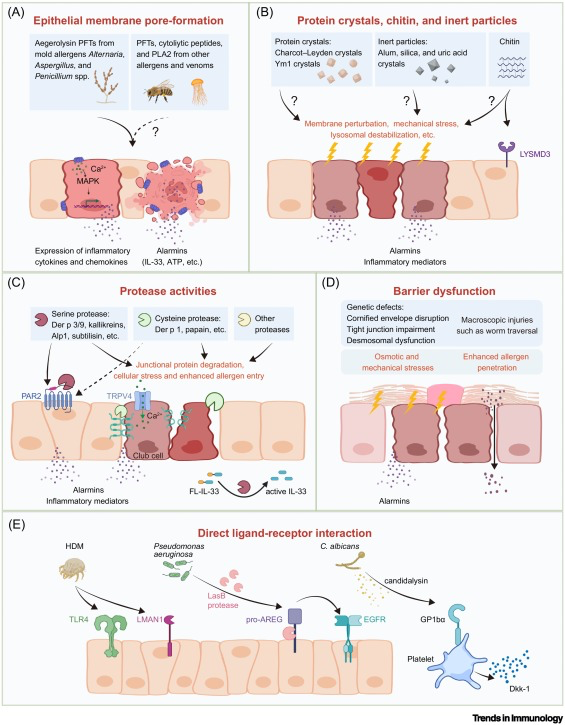 除膜穿孔外,蛋白晶体、蛋白酶活性以及广义的屏障缺陷也被认为是重要的II型免疫启动因素。研究表明,蛋白晶体可作为佐剂诱导II型反应,其晶体形态本身可能是决定免疫活性的关键因素,但宿主如何识别蛋白晶体仍不清楚。许多过敏原则具有蛋白酶活性,既可直接破坏细胞间连接,增强抗原跨屏障进入,也可促进IL-33加工或诱导上皮应激,从而放大早期警报素信号。与此同时,人类与小鼠遗传学研究均提示,屏障缺陷本身即可显著增加过敏性疾病易感性,例如FLG缺陷与特应性皮炎密切相关。但不同类型屏障扰动如何被分子层面识别,并进一步转化为II型免疫信号,目前仍存在大量空白。